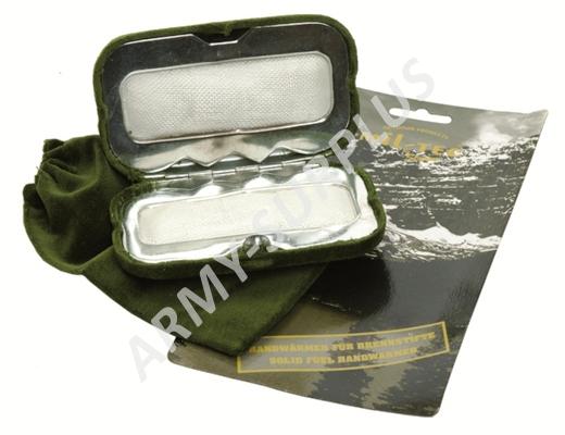 - do krabičky se vloží zapálený uhlík, krabička se zavře a vloží do sáčku, sáček si vložíte do kapsy a můžete si ohřívat ruce